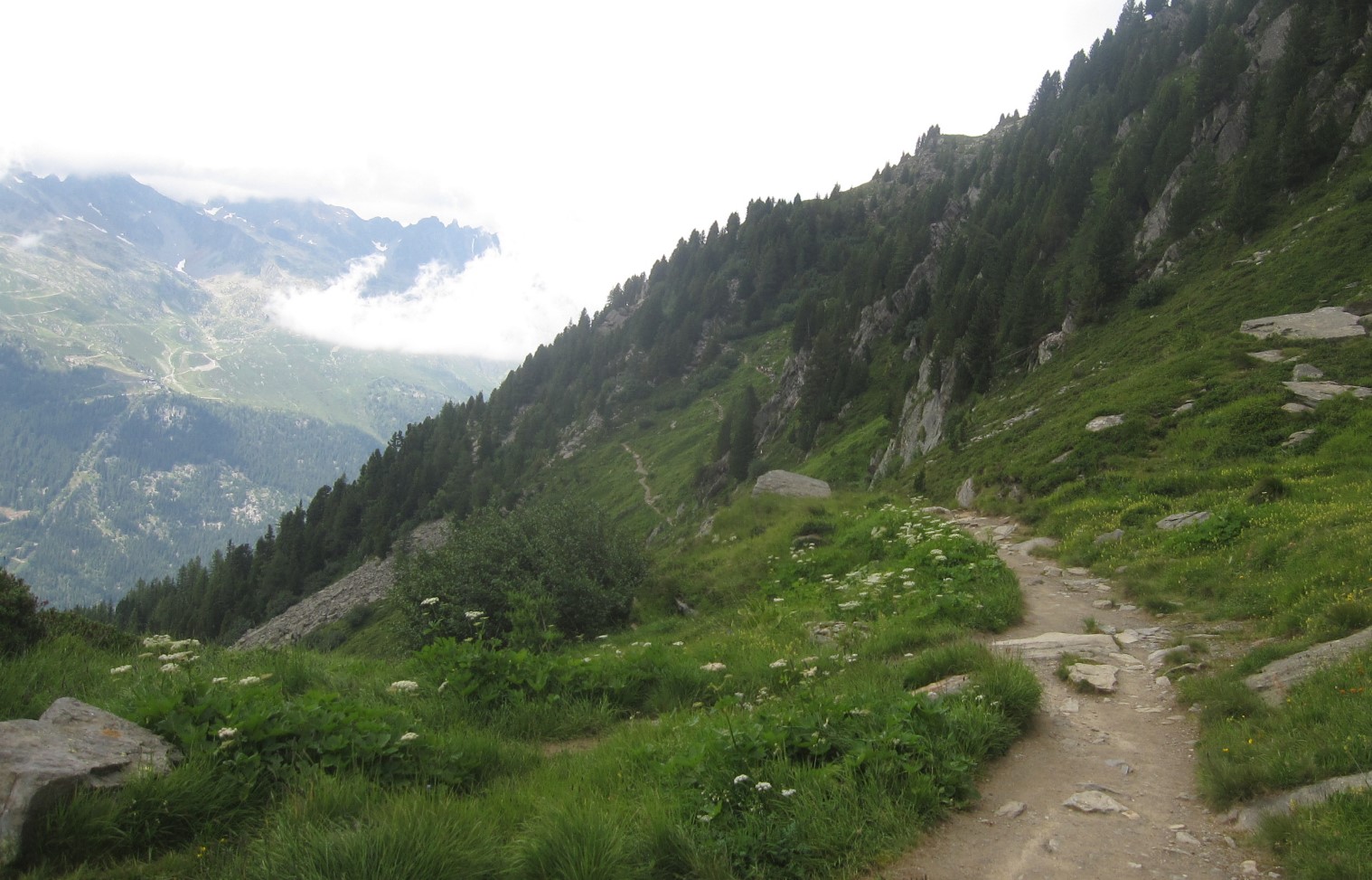 Небольшая передышка (минут 15-20) около приюта и дальше в путь, собственно по Большому Северному Балкону Шамони - по горизонтальной тропе, которая идет примерно на высоте 2100-2200 метров. Тут идет довольно много пешеходов, как понимаю, большинство из них поднима.тся сюда (2400 м) на "вагоне" от Шамони, потом идут по Балкону до Montenvers (шикарное место: красивые виды, много разных экспозиций, кафе и вообще...), а оттуда спускаются в Шамони на паровозе.